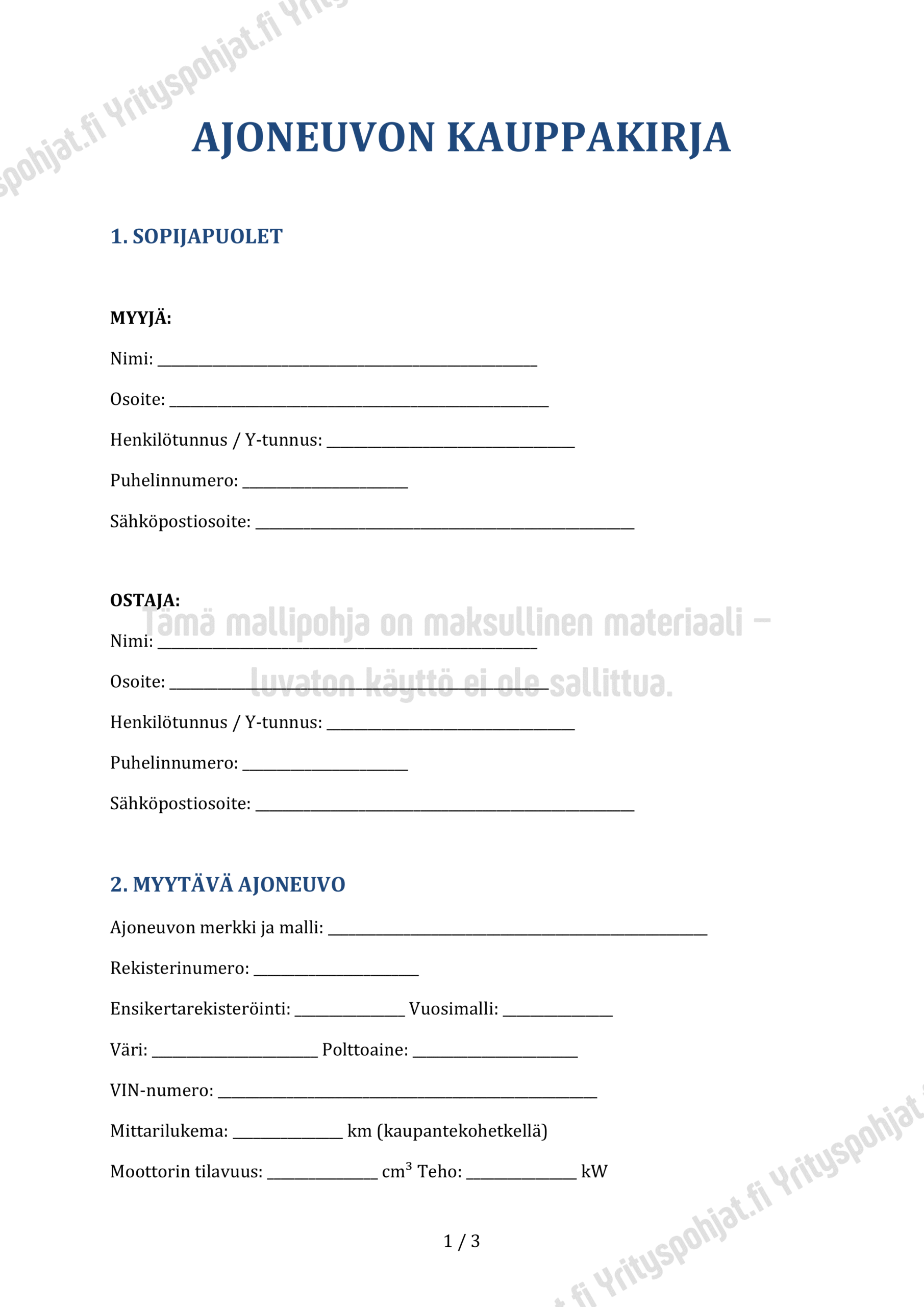 Helppokäyttöinen ja selkeä ajoneuvon kauppakirjapohja ajoneuvokauppoihin. Saat sekä muokattavan Word-tiedoston että valmiin PDF-version, molemmat A4-koossa. Tuotekuvissa näet kaikki kolme sivua kokonaisuudessaan ennen ostoa. Word-versio mahdollistaa tarvittaessa täysin yritys- tai tilanteenkohtaiset muutokset.