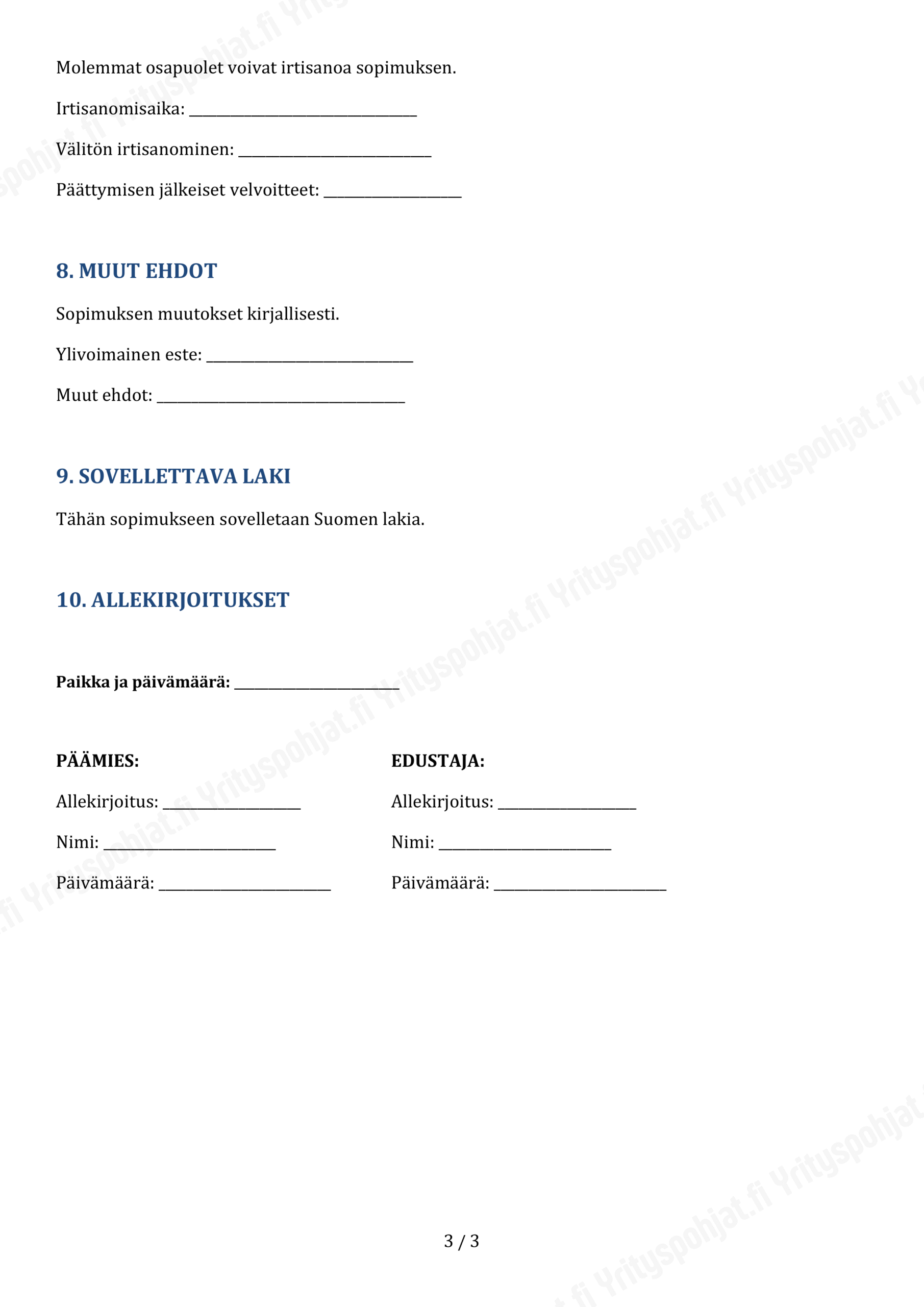 - Palkkion muoto ja määrä (kiinteä, tunti- tai tulospalkkio)