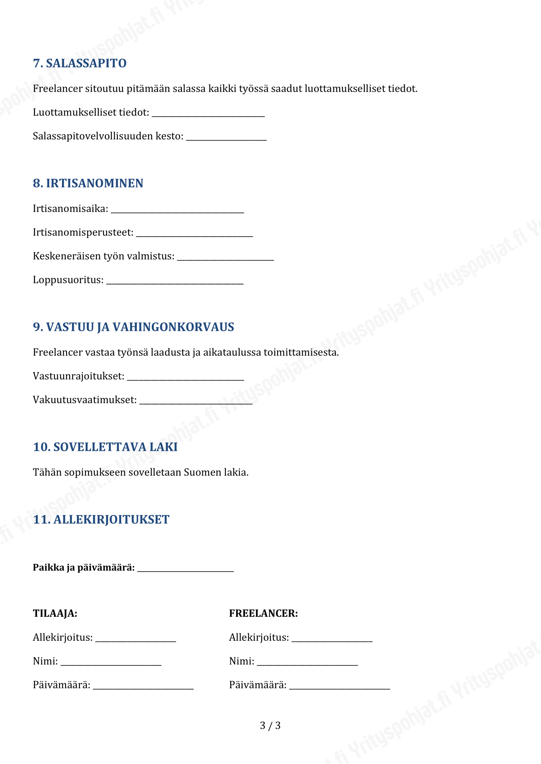 Dokumentti on rakennettu selkeästi ja loogisesti, mikä helpottaa sopimuksen täydentämistä ja räätälöintiä freelancer-projektin erityistarpeiden mukaisesti. Pohja sisältää keskeiset sopimuselementit, jotka freelancer-sopimuksessa yleensä käsitellään.