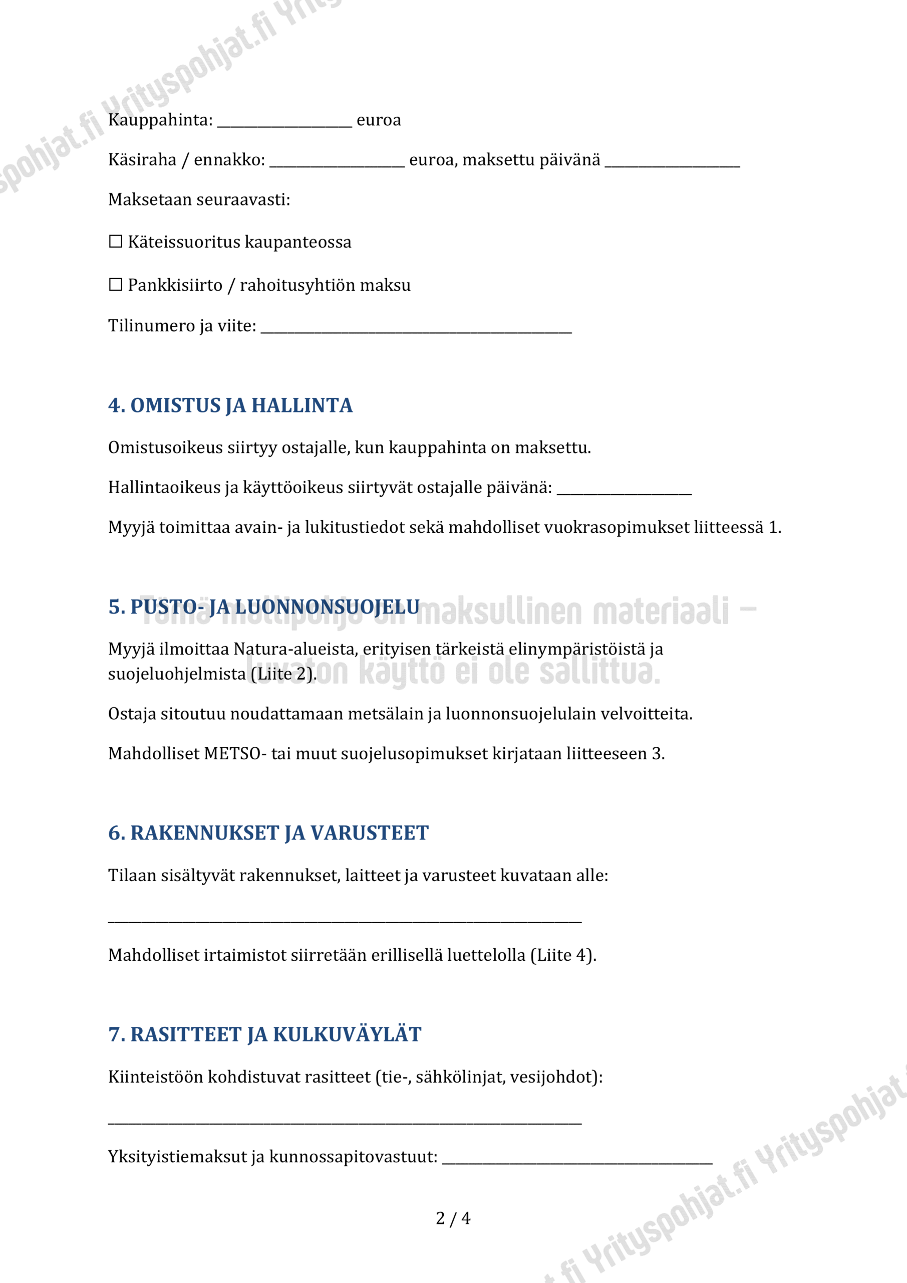 • Osio käsirahalle, kauppahinnalle ja maksuaikataululle.
