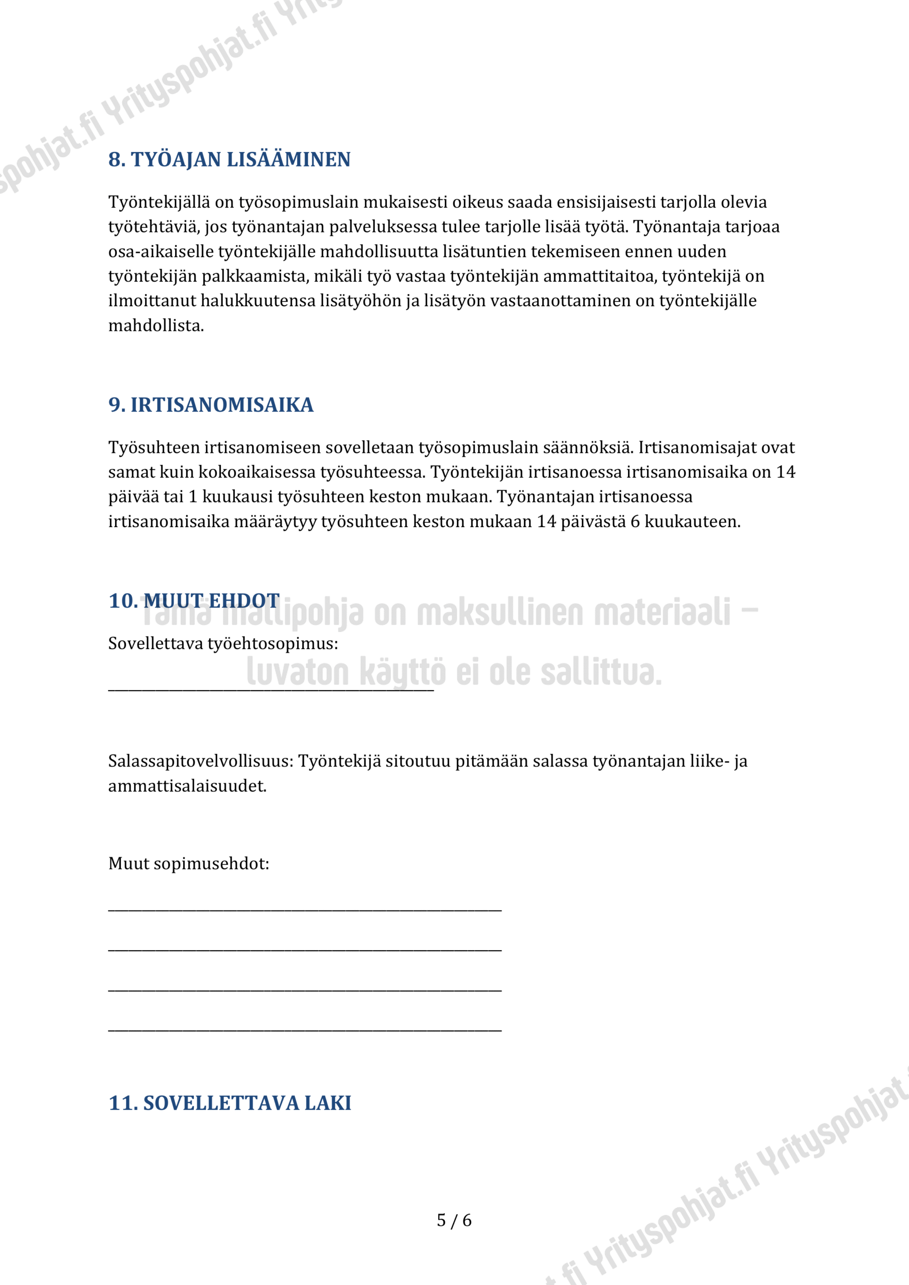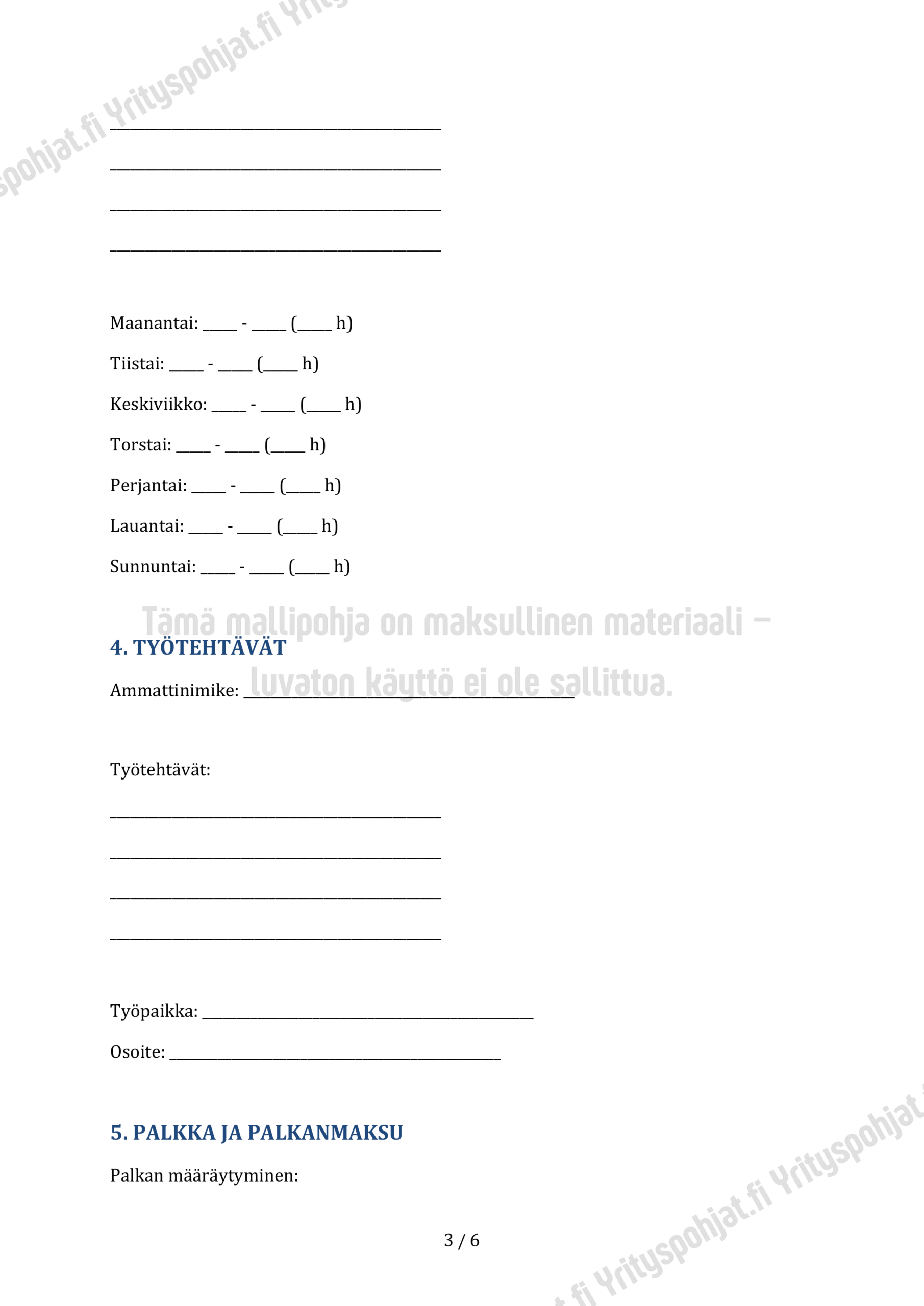 Dokumentissa käsitellään sopijapuolia, työnkuvaa, työaikaa, palkkausta, lomia, työnantajan ja työntekijän velvollisuuksia, työturvallisuutta sekä liitteitä. Lopussa on allekirjoitusosio.