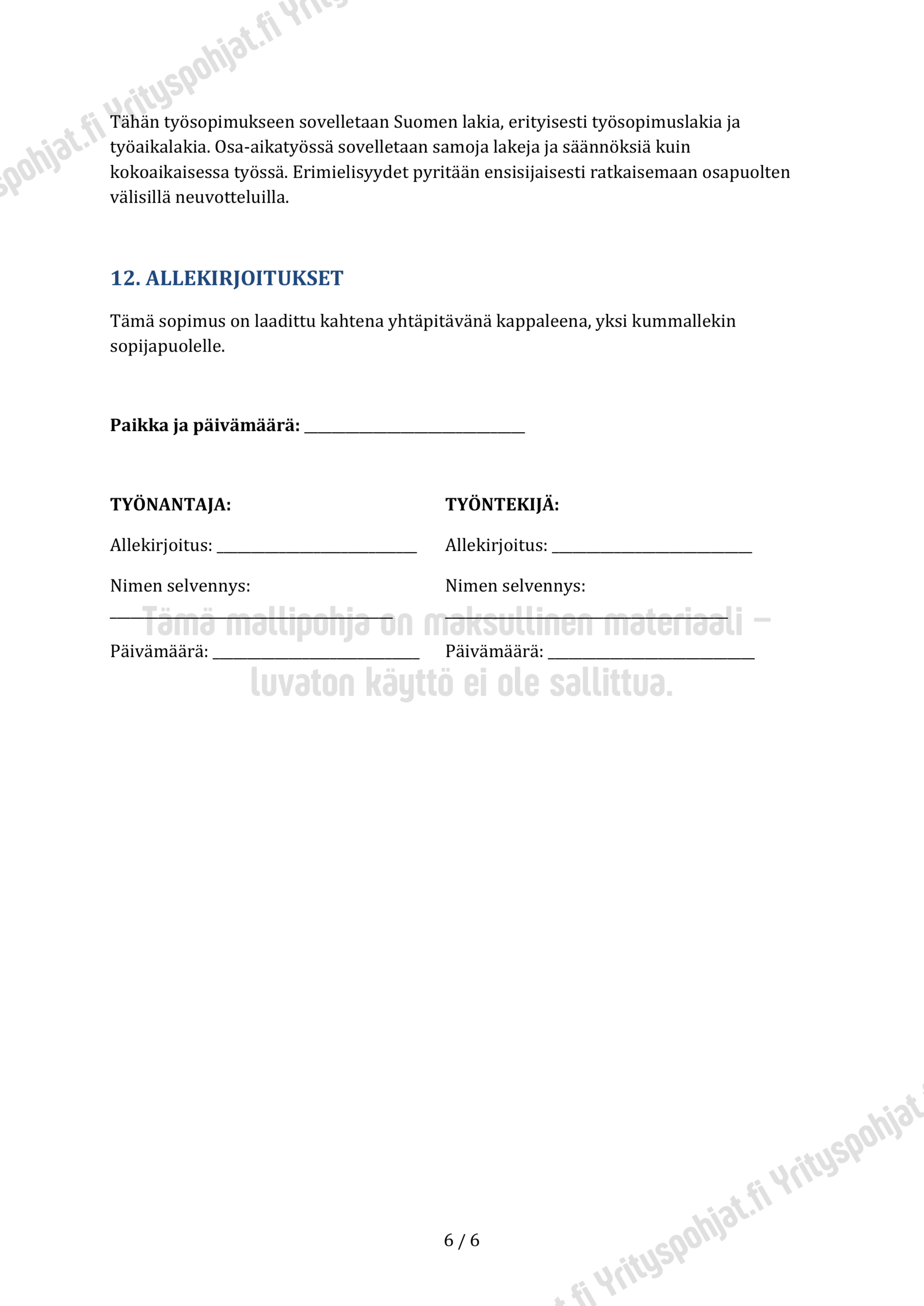 Osa-aikatyössä on tärkeää sopia työaikajärjestelyistä, palkasta ja muista käytännöistä selkeästi. Tämä malli varmistaa, että työnantaja ja työntekijä käyvät läpi kaikki perusasiat ennen työn aloitusta.