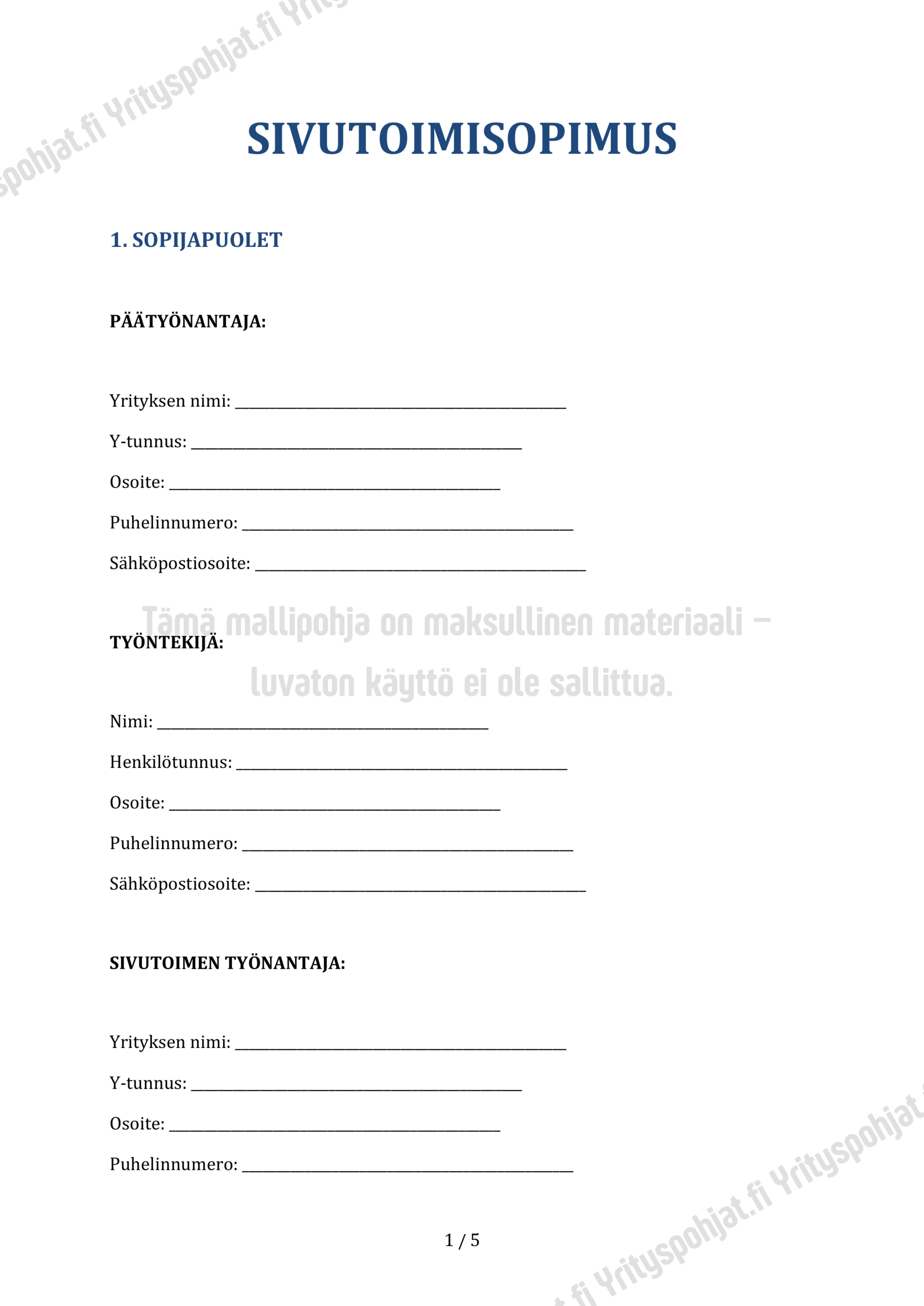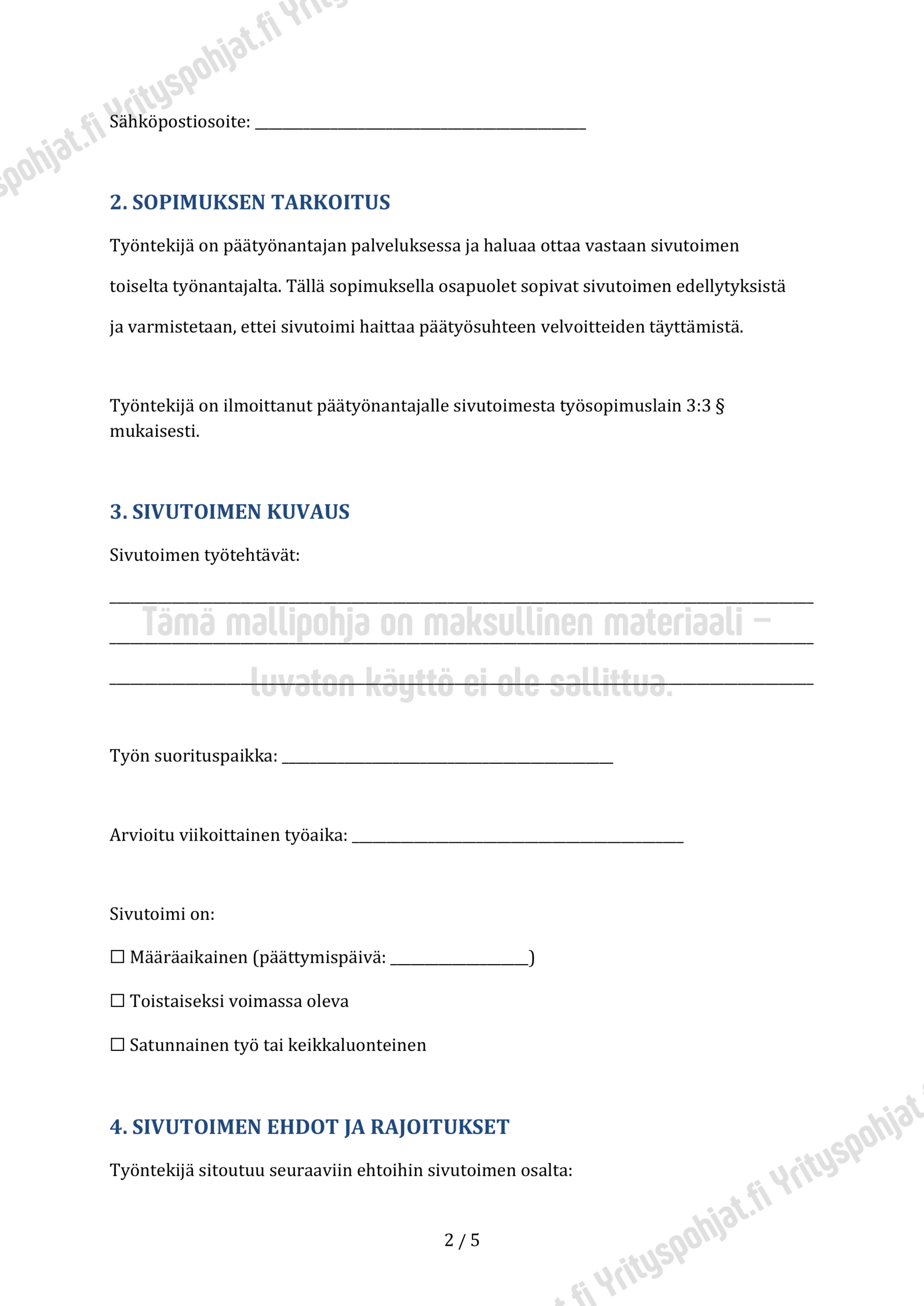 Saat muokattavan Word-version ja valmiin PDF:n A4-koossa. Malli selkeyttää tilannetta, jossa työntekijä hoitaa toisen työnantajan tehtäviä päätyön rinnalla, ja auttaa sopimaan käytännön järjestelyistä.