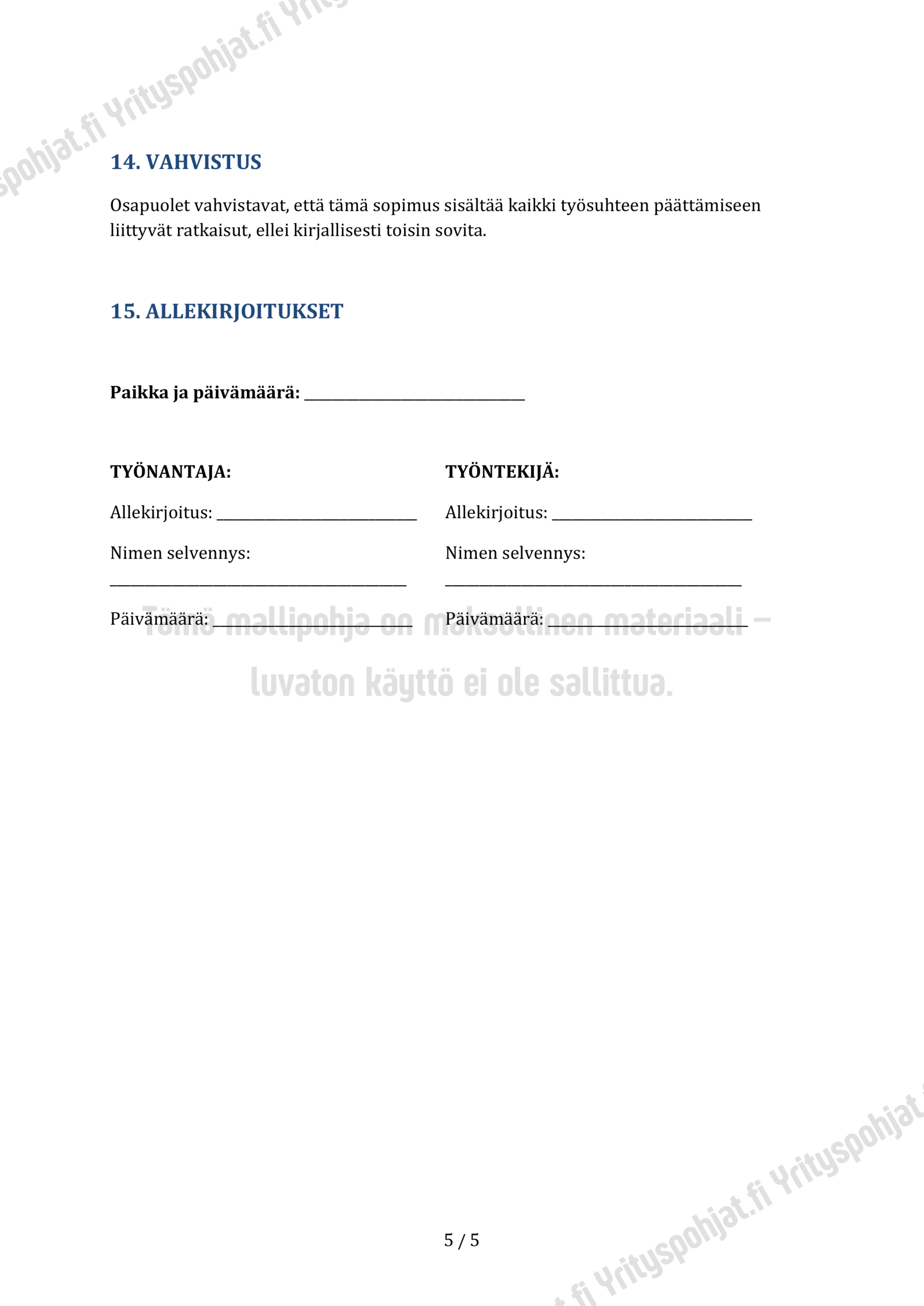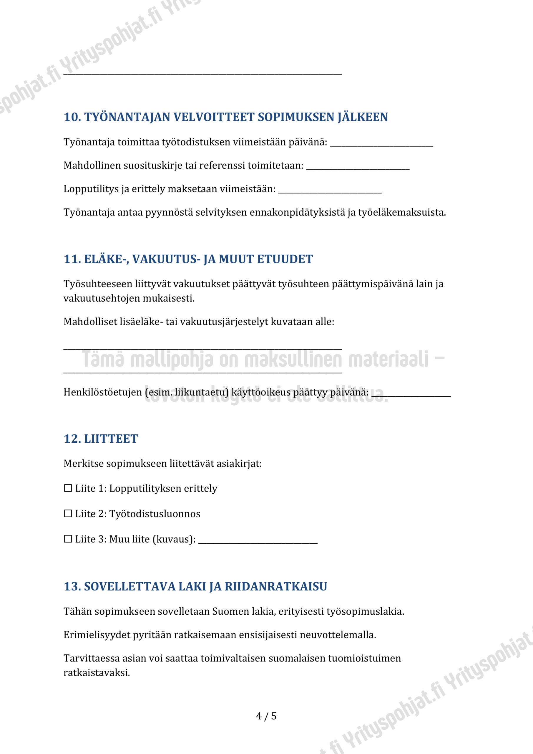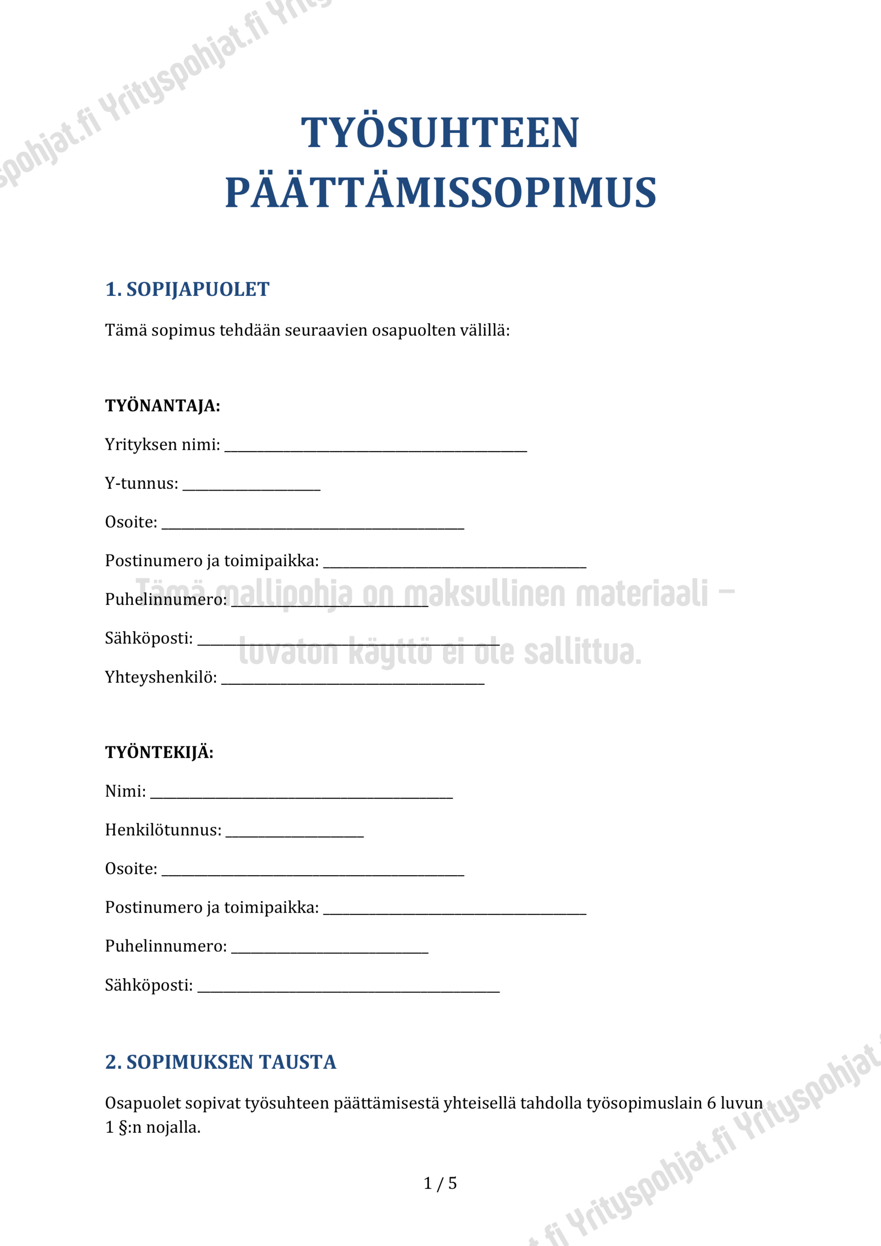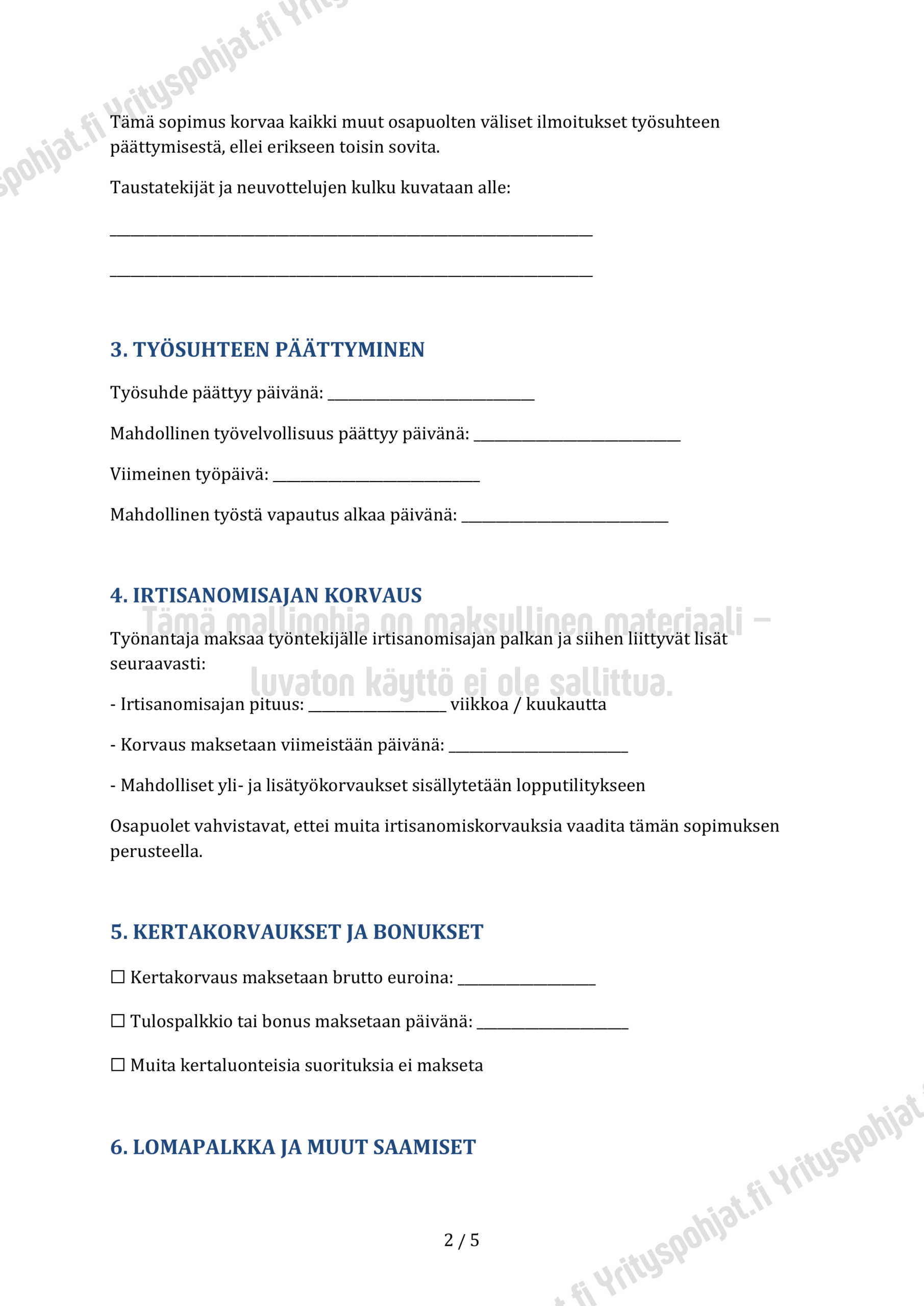 Saat muokattavan Word-version ja valmiin PDF:n A4-koossa. Pohja auttaa sopimaan työsuhteen päättymisestä hallitusti, olipa kyse yhteisymmärryksestä, muutosneuvottelusta tai ulkoistuksesta.