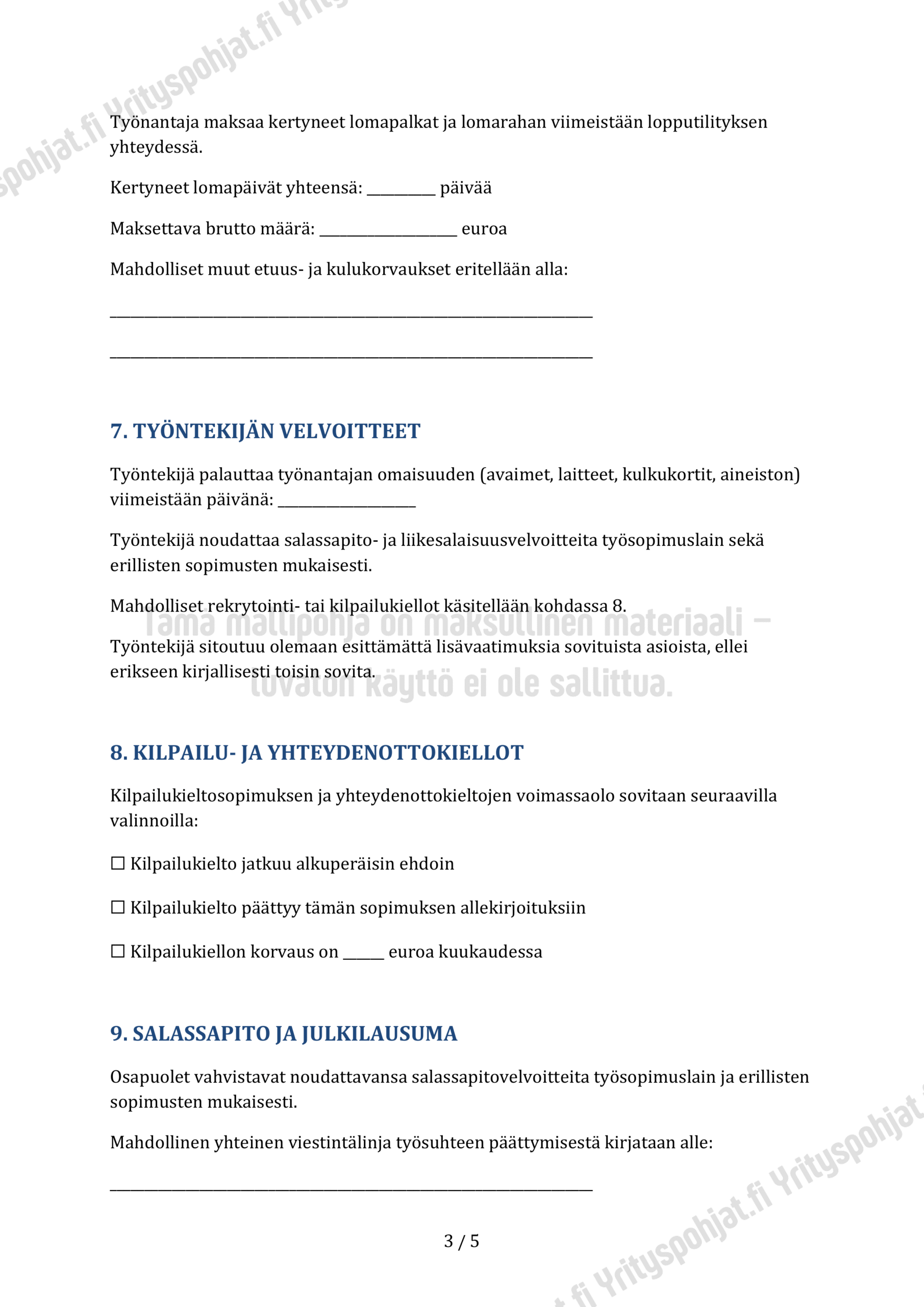 - Tila työnantajan ja työntekijän tiedoille, työsuhteen alkamis- ja päättymispäivälle.
