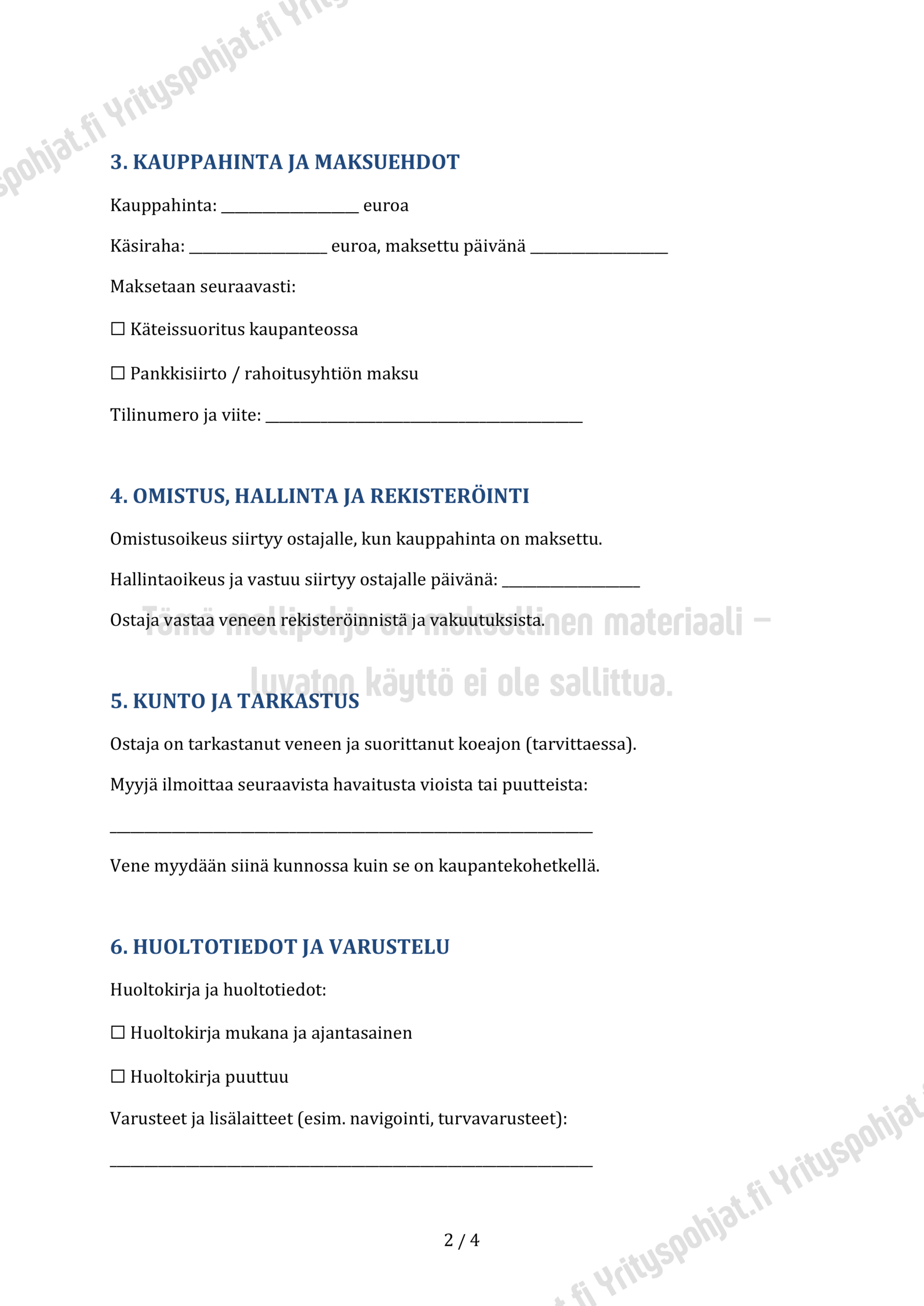 Pohja soveltuu sekä yksityisten että veneliikkeiden kauppoihin ja antaa selkeän tarkistuslistan kaupantekotilaisuuteen.